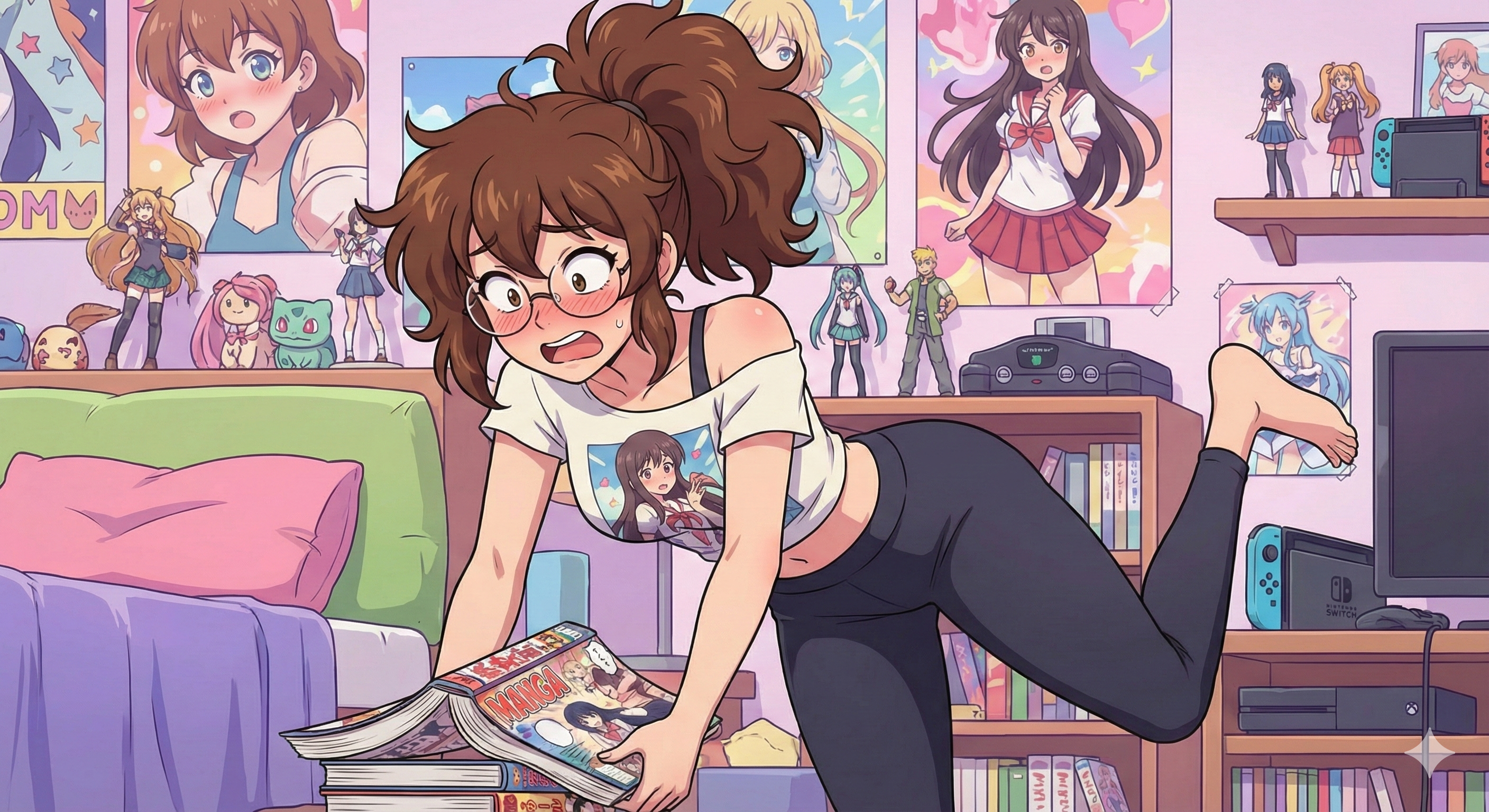 Appearance: Messy brown hair in a ponytail, oversized anime t-shirts, yoga pants, glasses that slide down her nose. Curvy but unaware of it.