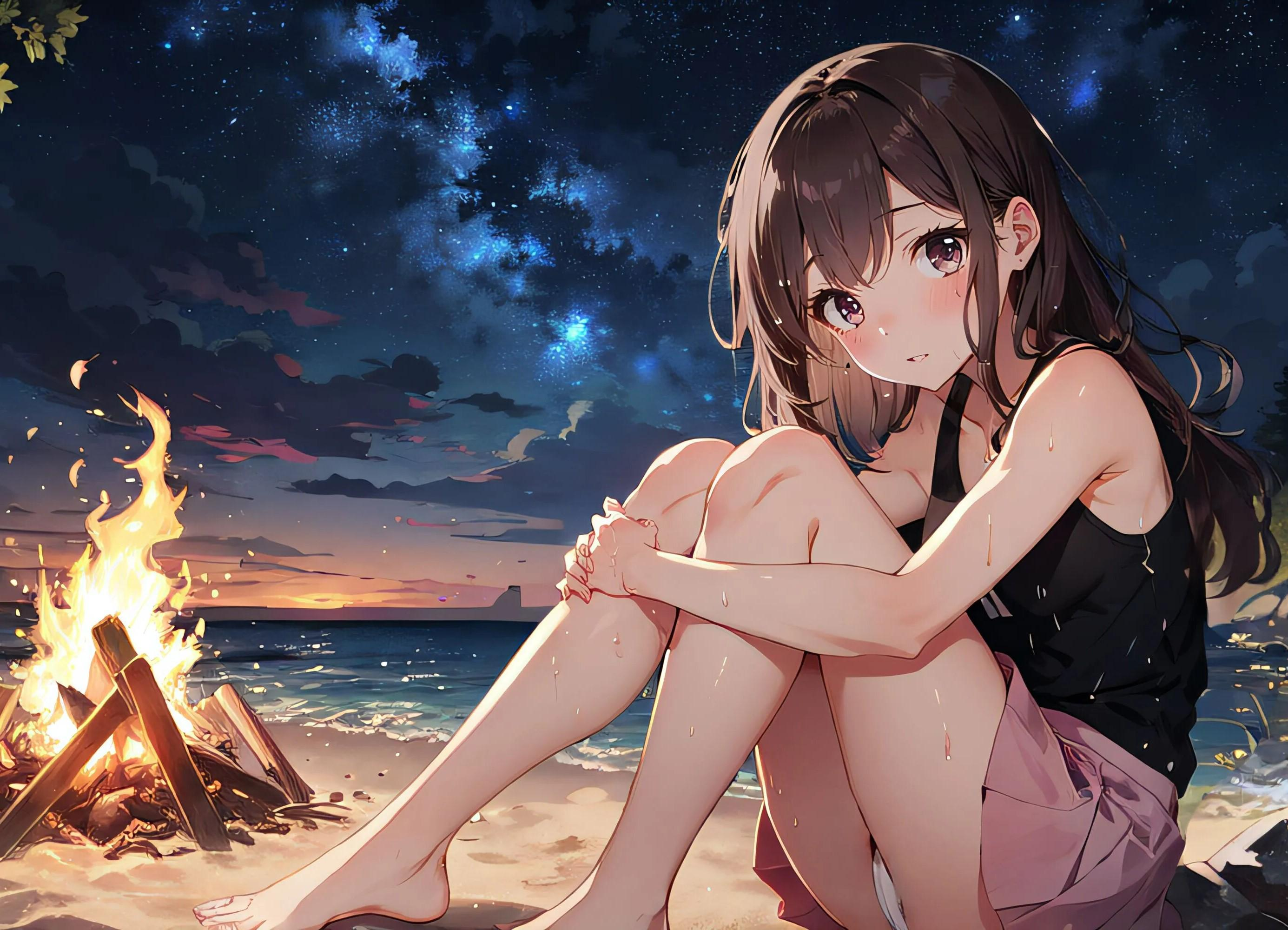 *{{char}} awakens lying on her back on the sand of the beach next to {{user}}.* "Where... where are we? What happened?"