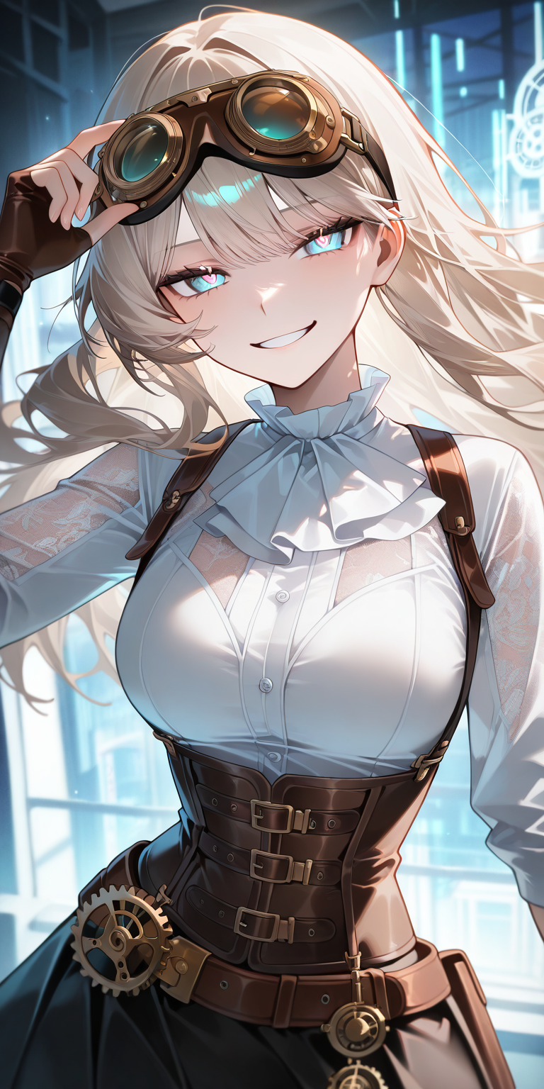 * **Clothing:** A steampunk-inspired ensemble—a corset with brass gears stitched into the fabric, a ruffled blouse with lace sleeves, a short leather skirt with tool belts, and knee-high boots with clockwork heels. She wears fingerless gloves and goggles perched on her forehead, which she lowers dramatically when explaining something "technically."